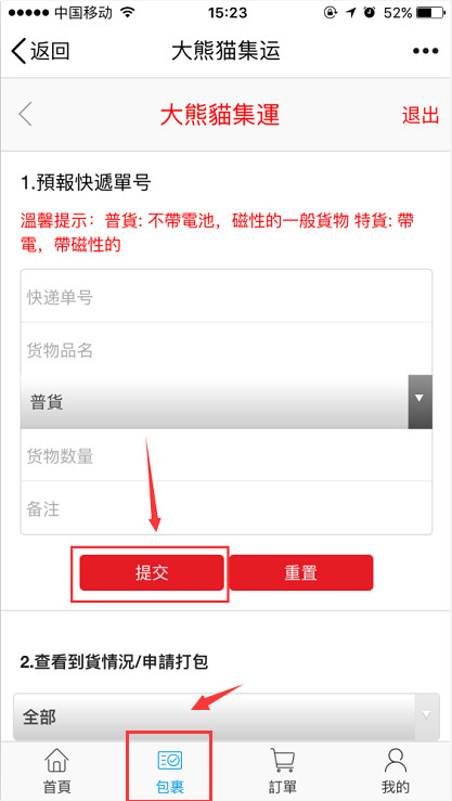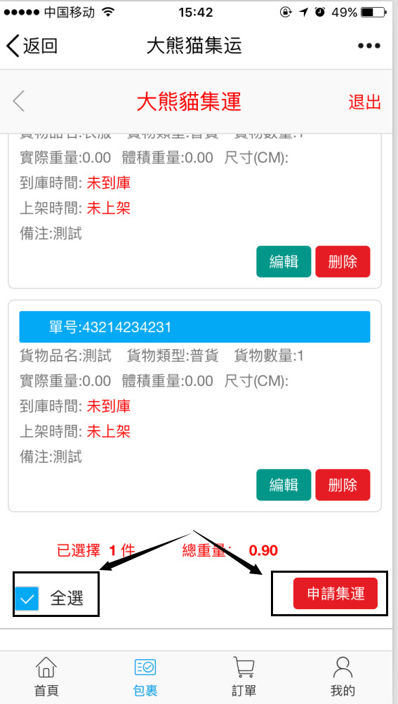 第五步:快递到达集运仓后,集运系统会主动通知您可进行申请打包