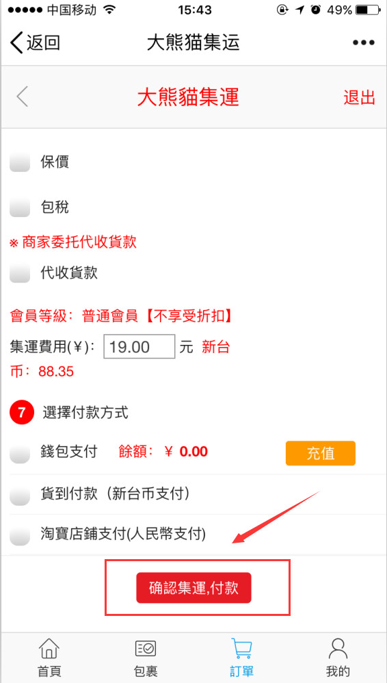 第七步:选择付款方式(支持支付宝微信支付)最后不要忘记点击确认集运哦