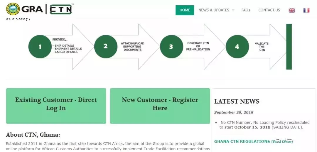 发货人/承运人需在官网https://www.ctnghana.com/上传以下文件:商业发票、出口报关单扫描件(符合要求的报关预录单也可以)、装箱单,24-36个小时内会得到一个未生效的CTN号码。
