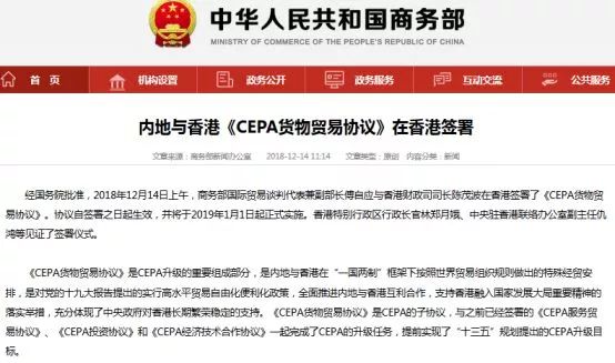 国务院批准,2018年12月14日上午,商务部国际贸易谈判代表兼副部长傅自应与香港财政司司长陈茂波在香港签署了《CEPA货物贸易协议》。